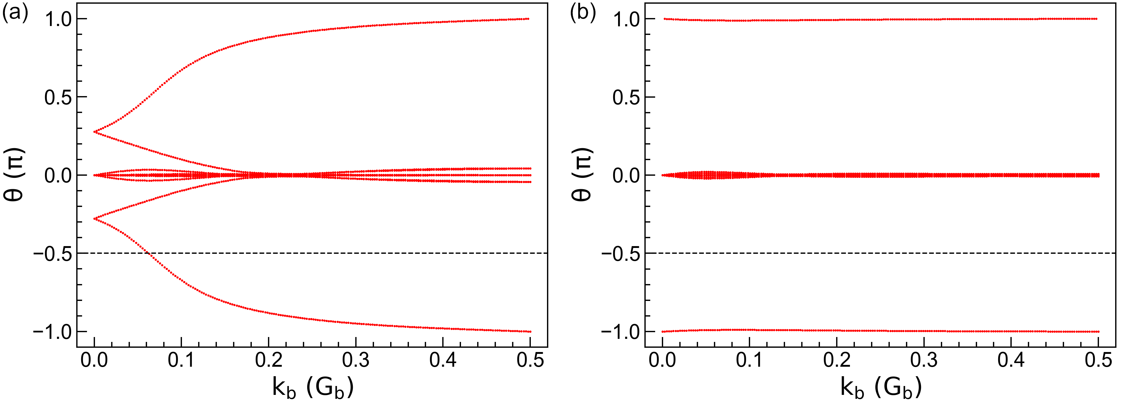 Topological phases \(\theta_m^D\) of bilayer bismuth under SOC intensity of (a) \(\lambda\) = 1.5 eV and (b) \(\lambda\) = 0.15 eV. The horizontal dashed lines indicates the reference lines with which the crossing number is determined.
